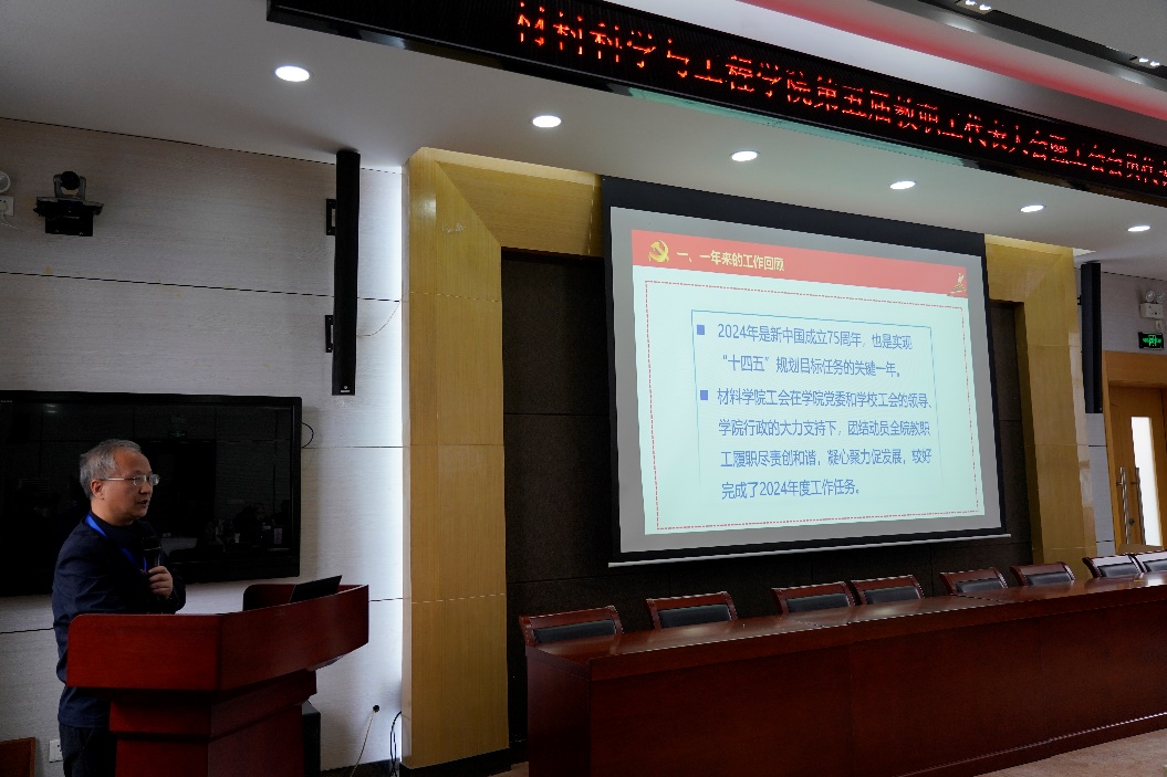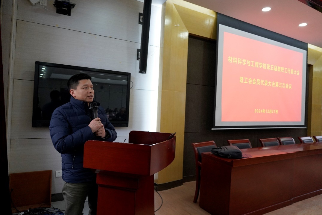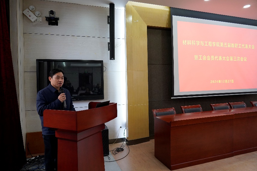 大会在庄严的国歌声中拉开序幕。校工会常务副主席曾庆东同志代表校工会对材料学院五届三次“两代会”的召开表示热烈祝贺。他对材料学院工会一年以来的各项工作,特别是对学院积极参加校工会组织的各项文体活动并取得优异成绩给予充分肯定。他希望材料学院工会要善于发挥自身优势,围绕中心、突出重点、彰显作用,把教职工进一步团结起来,不断激发大家参与学院改革的热情和主人翁责任感,为学院内涵式高质量发展献计献策,增砖添瓦。