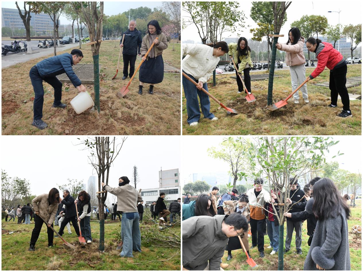 At 10 a.m., participants gathered at the north gate of the Nanhu Campus to kick off the tree-planting activity. Working in close coordination—digging holes, setting saplings, filling in soil, and watering—they carried out each step with care and efficiency. After more than an hour of effort, rows of young trees stood tall in the spring breeze, bringing a fresh splash of green to the campus. The smiles on participants’ faces reflected a shared sense of joy and accomplishment.