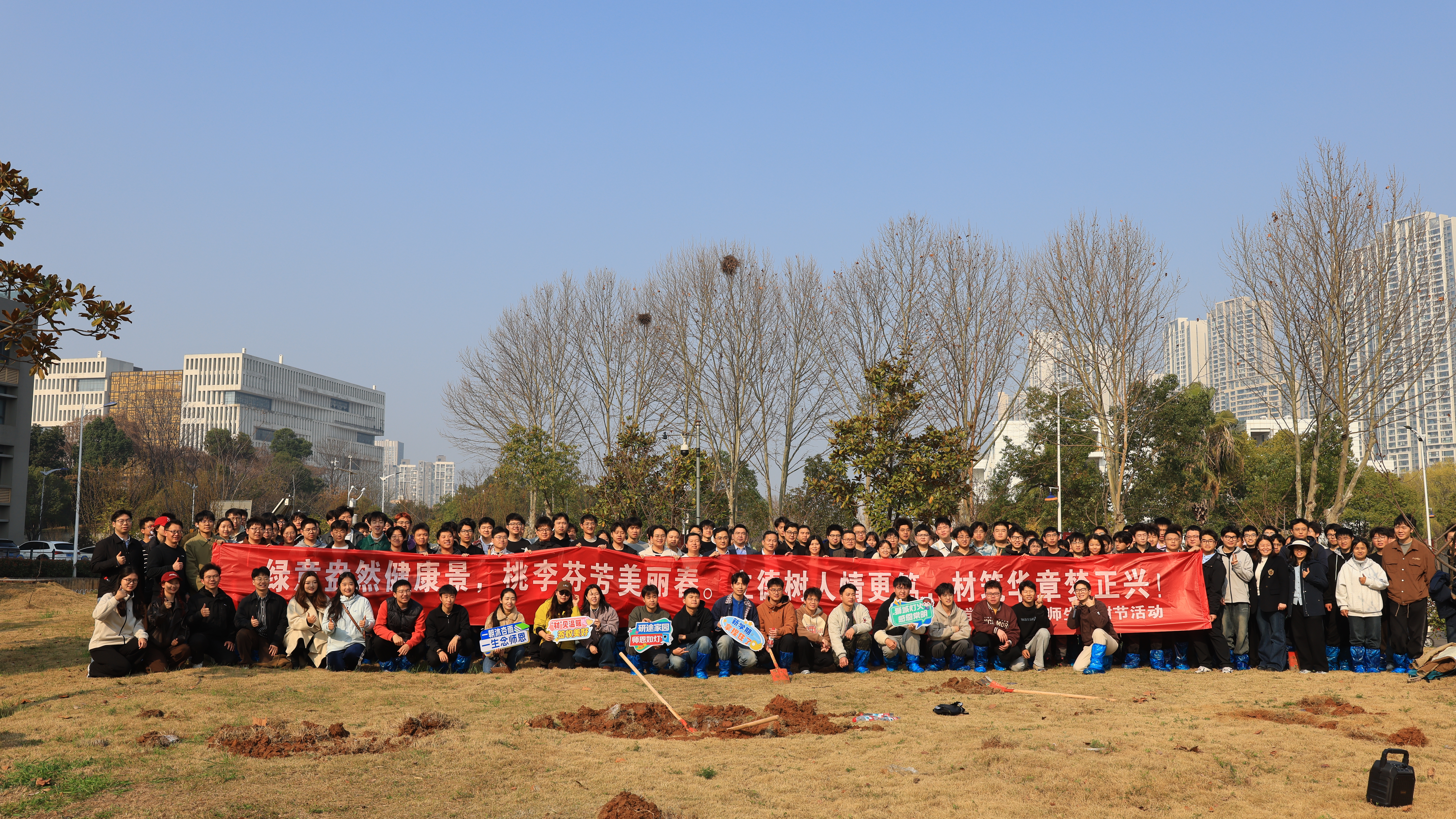 活动最后,师生们围聚在亲手栽种的树苗前合影留念,定格下春日植绿、青春筑梦的珍贵瞬间。据悉,材料学院师生植树活动已连续举办14届,成为学院落实学校三项教育中“爱校荣校”教育、五育并举、厚植师生根情文化、涵养优良育人氛围的特色品牌实践。活动有效强化了材料学子的劳动观念与团队协作精神,持续为建设美丽理工、培育时代新人注入动能。