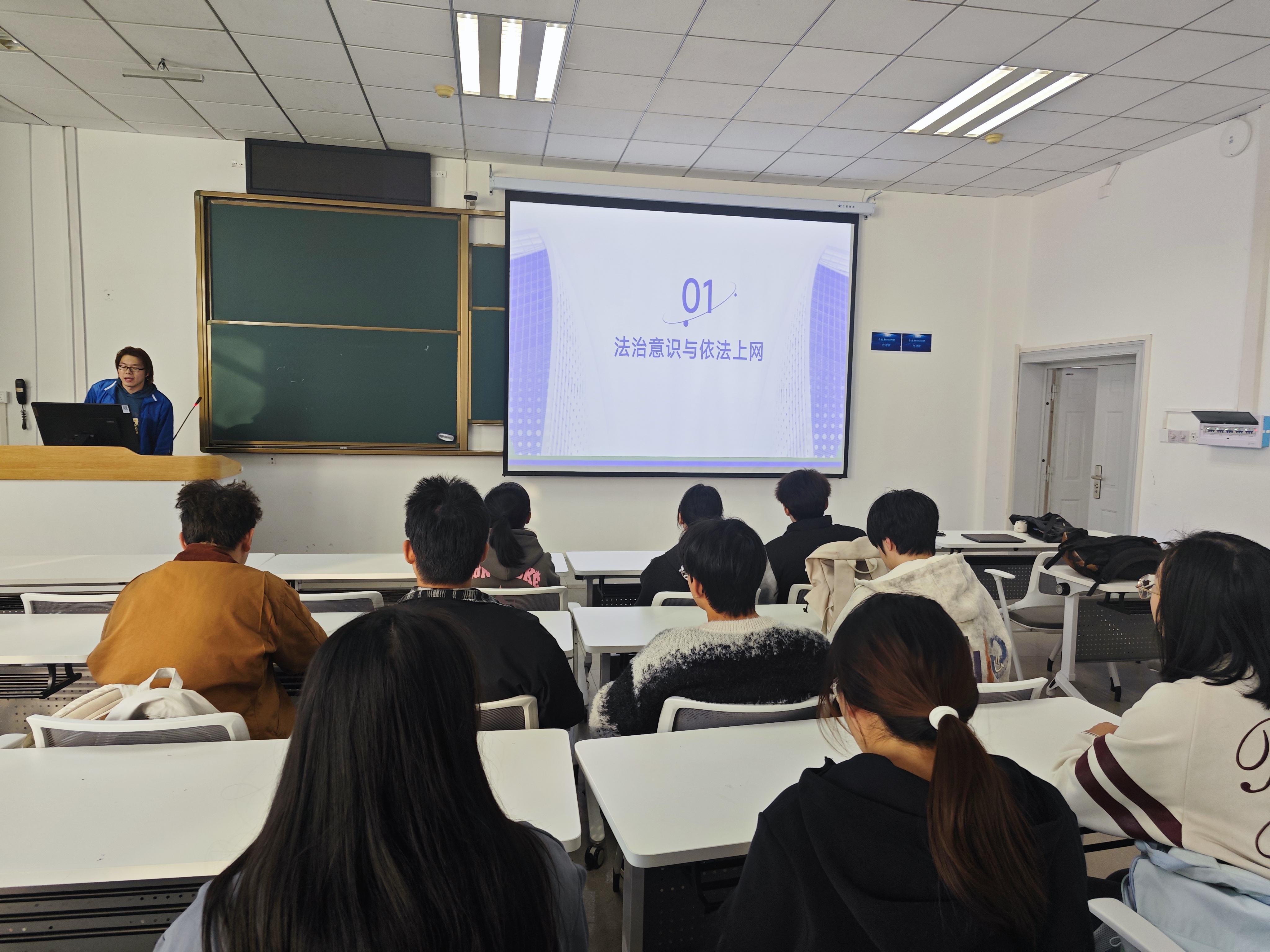 班会伊始,班长徐佳伟结合近期高校网络违规案例,深入剖析网络空间的法律边界。通过“法条解读+情景模拟”的形式,他组织学生分组讨论“传播虚假信息”“非法侵入系统”等行为的法律后果。针对网络谣言、语言暴力等乱象,他播放了“某高校学生因转发不实信息被处分”的警示视频,并引导同学们通过换位思考,深刻理解理性发言的重要性。