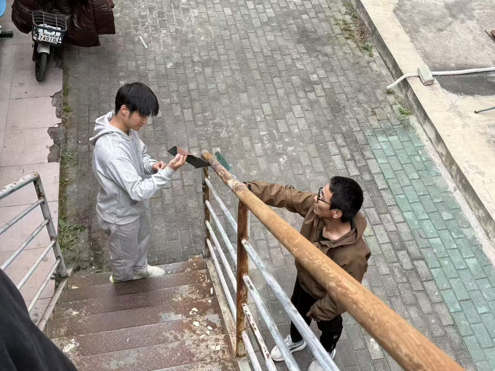 活动开始前,社区工作人员提前备好砂纸、环保漆、刷子、手套等工具。在团支书的统一安排下,同学们明确分工,迅速投入工作。面对扶手和座椅上的锈迹与斑驳漆面,大家先用砂纸仔细打磨,顺着纹理反复擦拭,确保不遗漏任何角落。遇到顽固锈渍,同学们耐心反复打磨,认真清理每一处浮锈和污迹,为后续上漆做好准备。打磨过程中,大家互相配合,及时清理产生的粉尘,保持作业区域整洁。