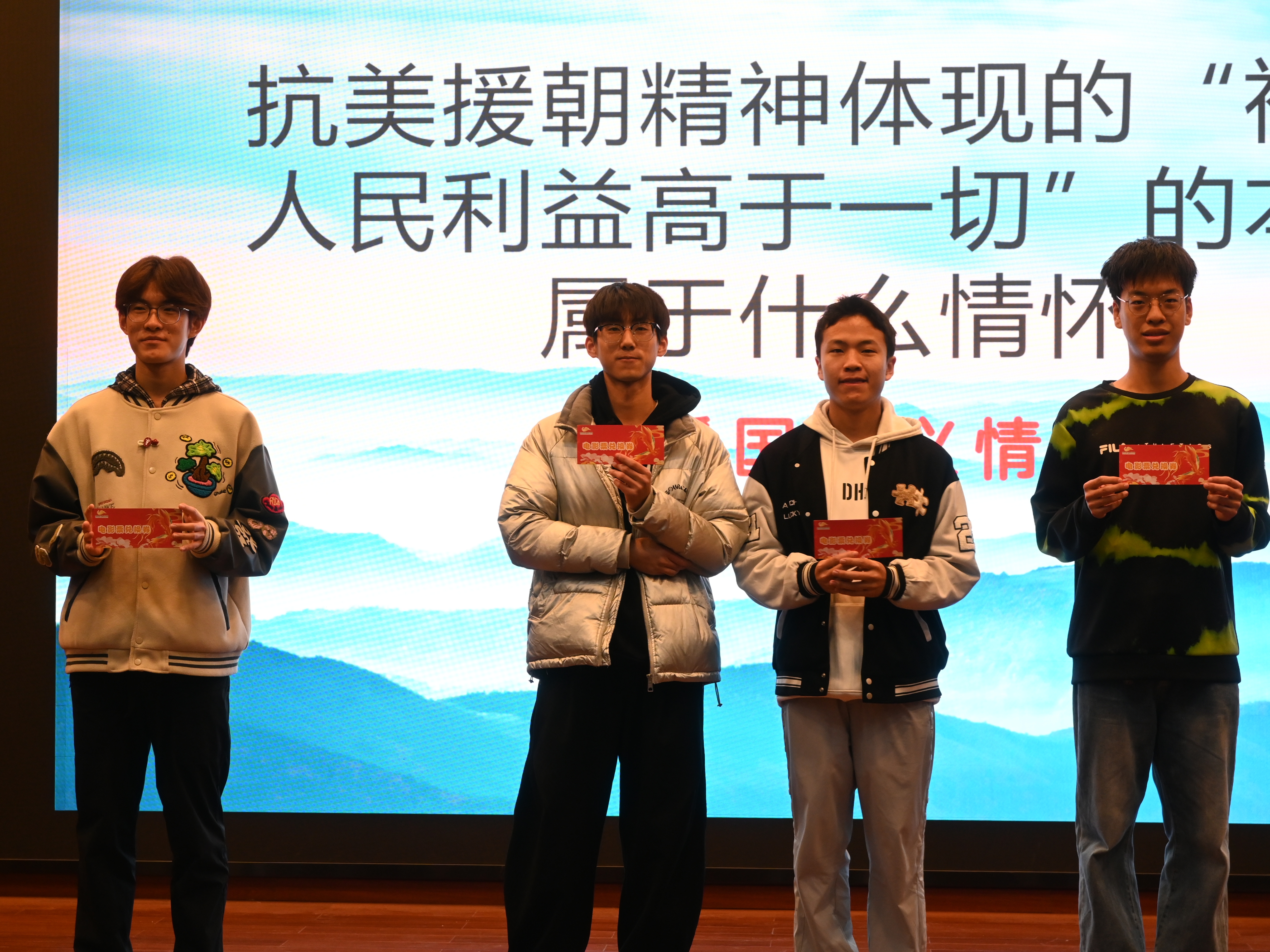 电影放映前,国防星火社团特别设置了历史知识问答环节,题目围绕抗美援朝历史、国家公祭日背景等内容展开。现场气氛热烈,同学们积极思考、踊跃作答。该班郭宸铭同学反应敏捷、回答准确,成功赢得电影兑换券,为班级争得荣誉,也展现出青年学子对历史知识的扎实掌握。