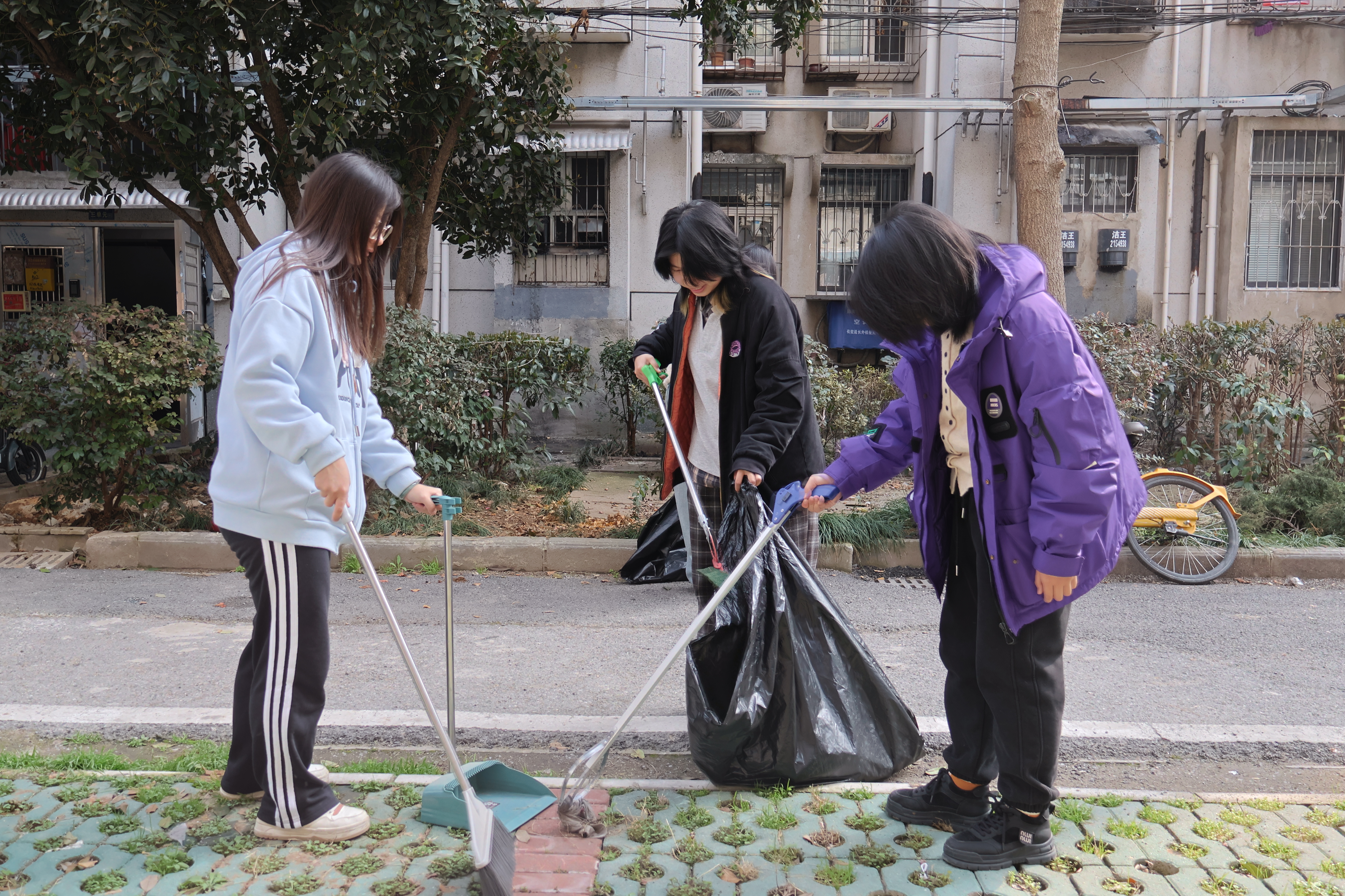 在社区工作人员的引导下,十余名志愿者准时在社区广场集合。经过简单分工,志愿者们分成两个小组,分别领取扫帚、簸箕、铲子、夹子和分类垃圾袋等清洁工具,随即分头前往各自负责的区域开展清扫工作。