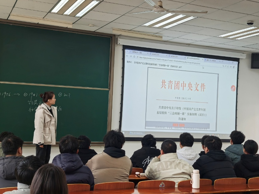 活动现场,王雨桐带领全体团员共同学习了《中国共产主义青年团章程》与《中国共产主义青年团基层组织“三会两制一课”实施细则(试行)》两份重要文件。在团章学习环节,团员们重点研读了团的组织制度、中央组织、地方组织、基层组织及团的纪律等核心内容,深刻领会了共青团作为党的助手和后备军的政治属性与使命担当。同学们结合“唯物史观”“社会生产”等理论要点,将团章学习与马克思主义基本原理相结合,进一步深化了对青年责任与时代使命的认识。