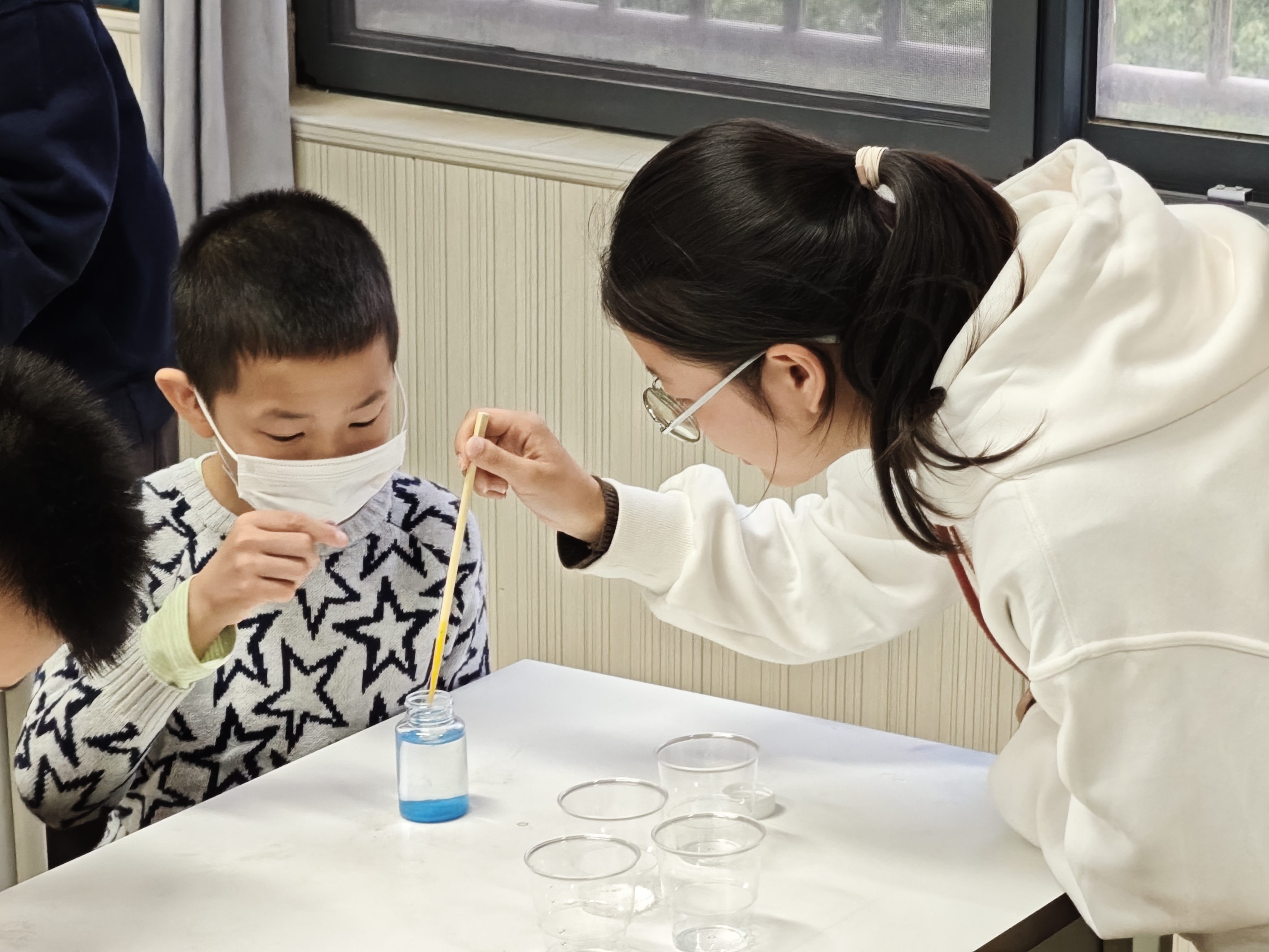 随后的实验环节将课程推向高潮。在文铄与志愿者的指导下,小朋友们亲手搭建美丽的水底花园。大家先将硅酸钠晶体加入水中快速搅拌,再倒入实验瓶,随后加入硫酸铜、氯化钙等材料。当一棵棵色彩斑斓的“小树”在瓶底悄然生长、摇曳生姿时,孩子们发出了阵阵惊叹,切身感受到了胶体化学的神奇魅力。