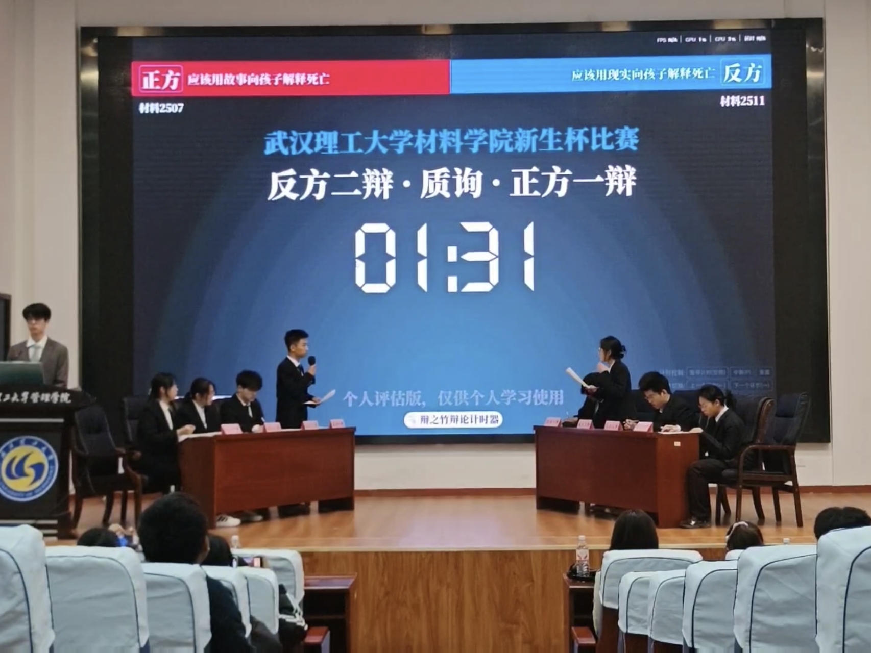 决赛现场,辩手们围绕“应该用故事还是现实向孩子解释死亡”这一辩题展开激烈交锋,气氛紧张热烈。在冠亚之争中,正方材料类2507班逻辑严谨、论证层层递进;反方材料类2511班则反应敏捷、反驳犀利。双方你来我往,精彩对决引得现场掌声不断。随后的季军争夺战同样精彩纷呈,材料类2514班与材料类2501班的辩手们沉着应对,各展风采,充分展现了新生辩手的潜力与活力。经激烈角逐与评委公正评判,材料2511班荣获冠军,材料2507班获得亚军,材料2501班获得季军。