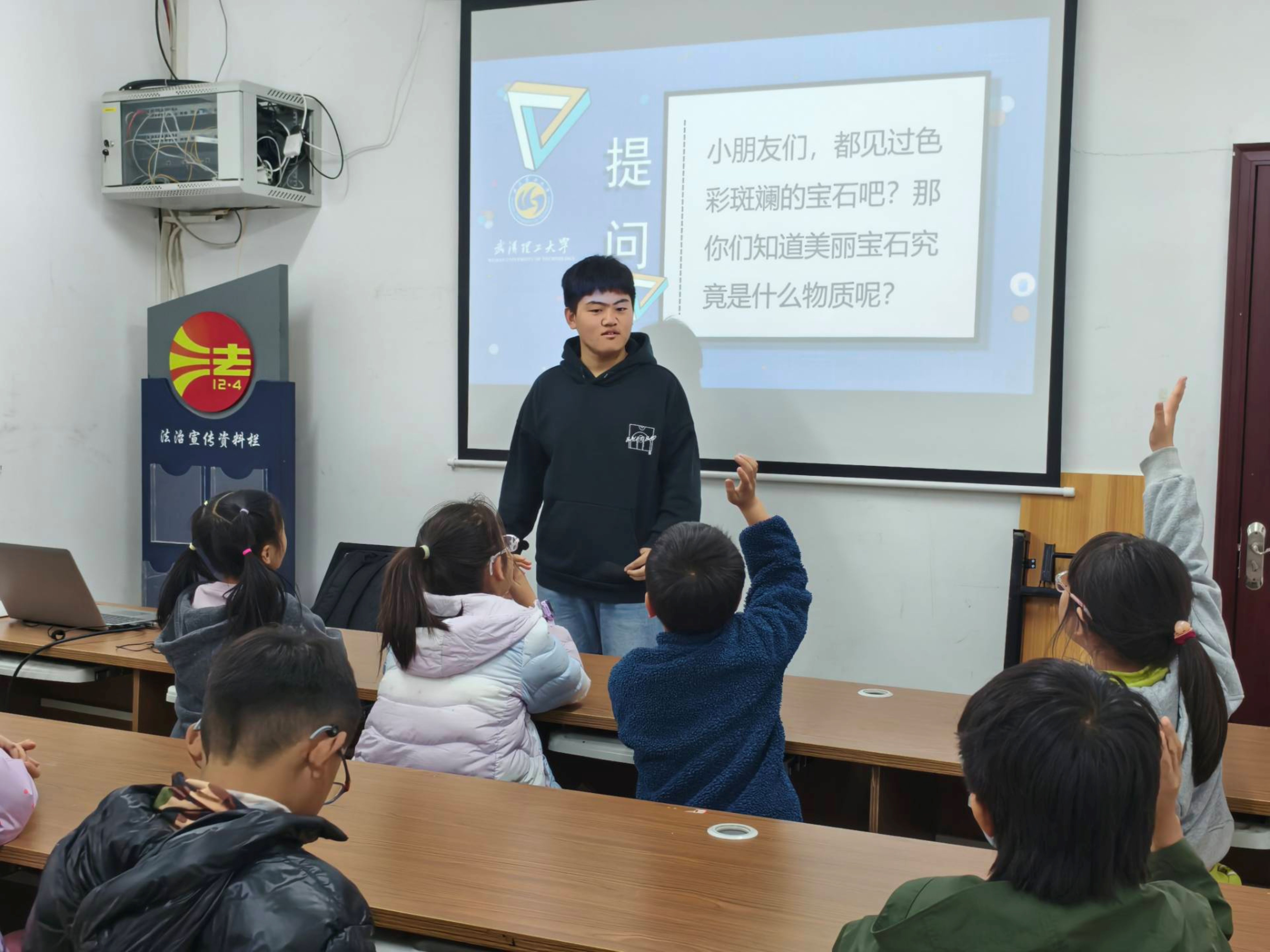课程伊始,主讲老师骆鸿宇以 “美丽的宝石是什么物质” 这一问题引发孩子们的好奇心,通过展示钻石、红宝石、蓝宝石、琥珀等晶体实物图片,让孩子们直观感受晶体的绚丽多彩。随后,他用 “蜜蜂的蜂巢”“搭乐高” 等生活化比喻,通俗解释了晶体的定义,并用食盐的方形颗粒为例,让抽象的科学概念变得通俗易懂。此外,志愿者介绍了晶体在生活中的广泛应用,让孩子们了解到科学与生活的紧密联系。