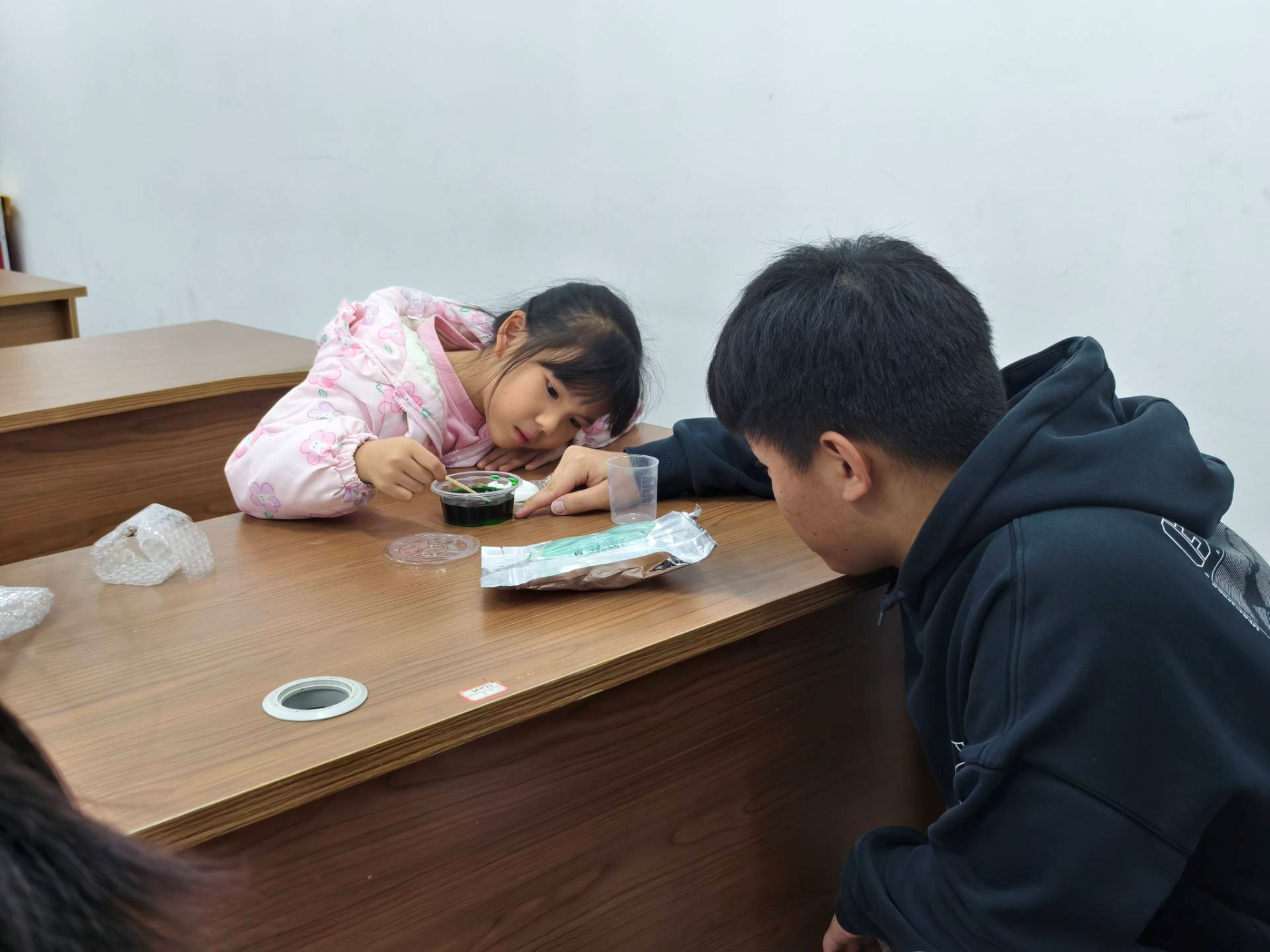 最受孩子们欢迎的当属晶体生长实验环节。志愿者详细讲解了 “水晶垂耳兔” 的生长原理,展示了晶粉、量杯、种植杯等实验材料,并分步演示了实验操作流程。同时,志愿者反复强调实验安全注意事项。在志愿者的指导下,孩子们亲手参与实验,近距离观察晶体生长过程,体验科学实验的乐趣。
