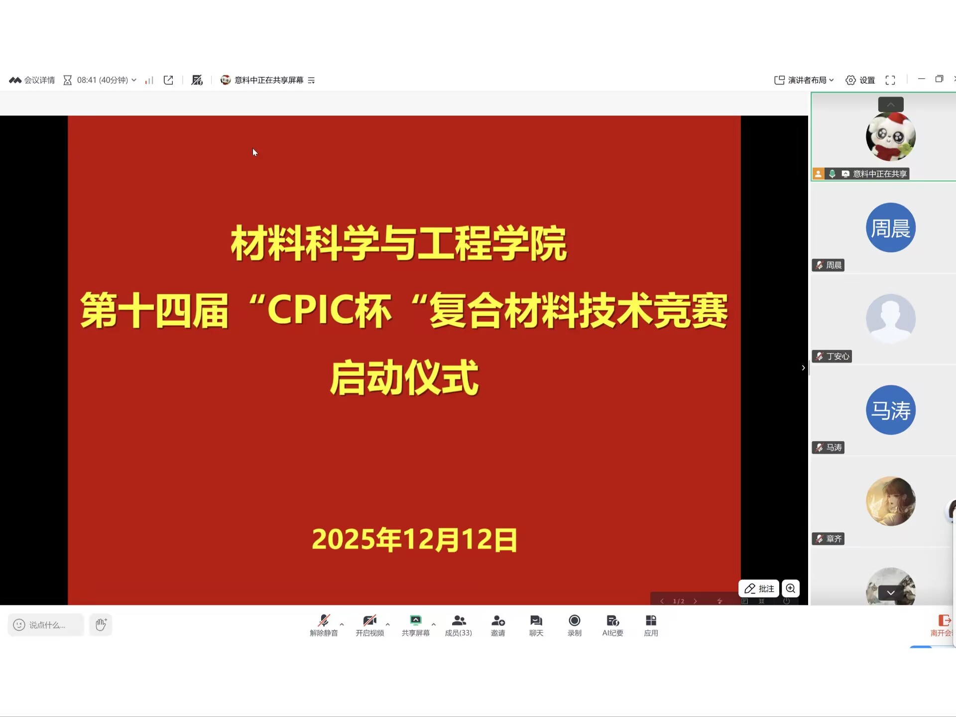 2025年12月12日晚7时,第十四届“CPIC杯”复合材料技术竞赛线上启动仪式顺利举行。本次竞赛由我院组织,并得到CPIC公司的赞助支持。学院相关教师、竞赛负责老师以及来自复合材料与工程、高分子材料等专业的多名学生在线参加了启动仪式。