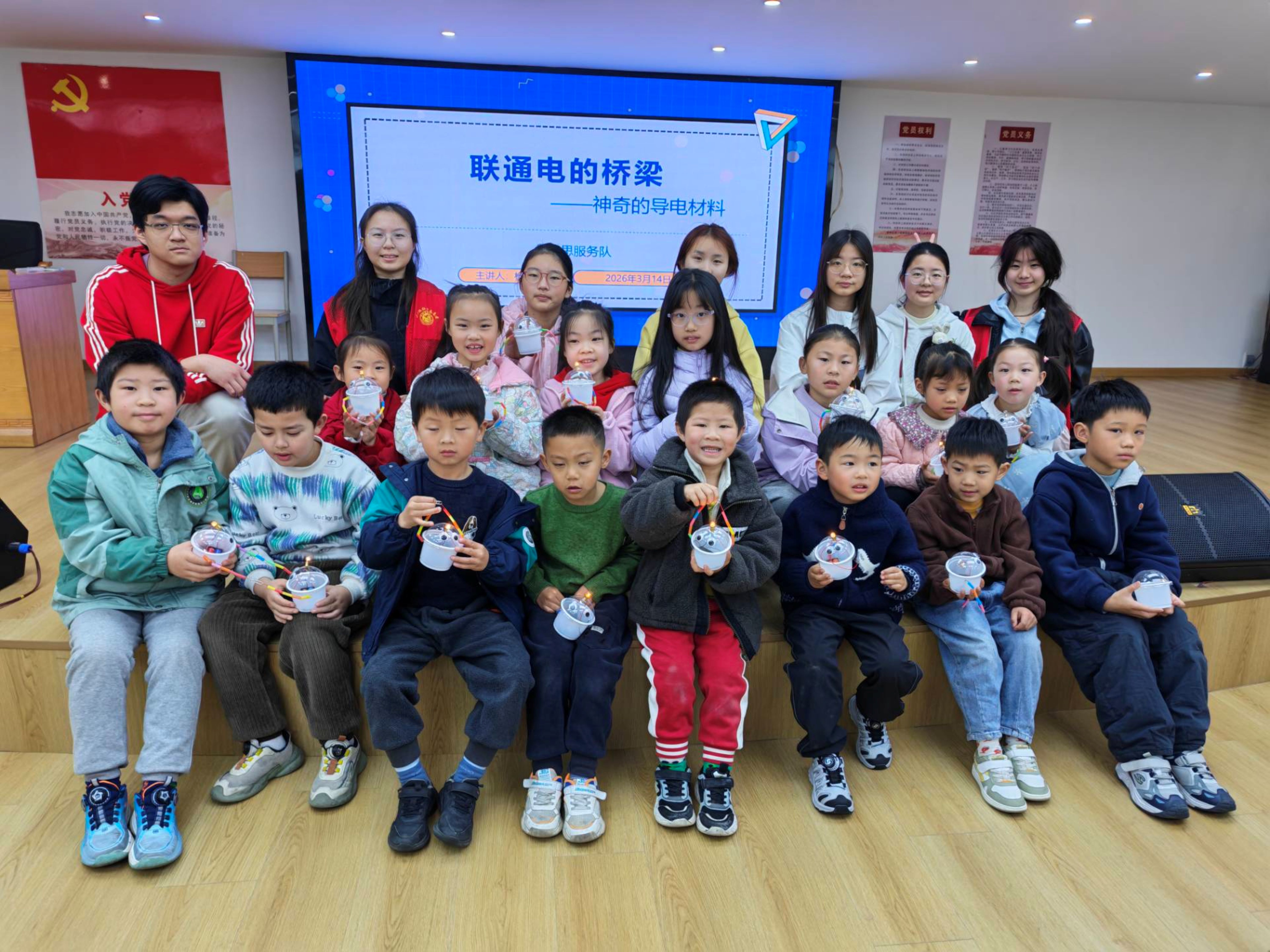 3月14日材启思服务队为启迪孩子们的科学思维,在川江池社区开展了“神奇的导电材料”科普课程。