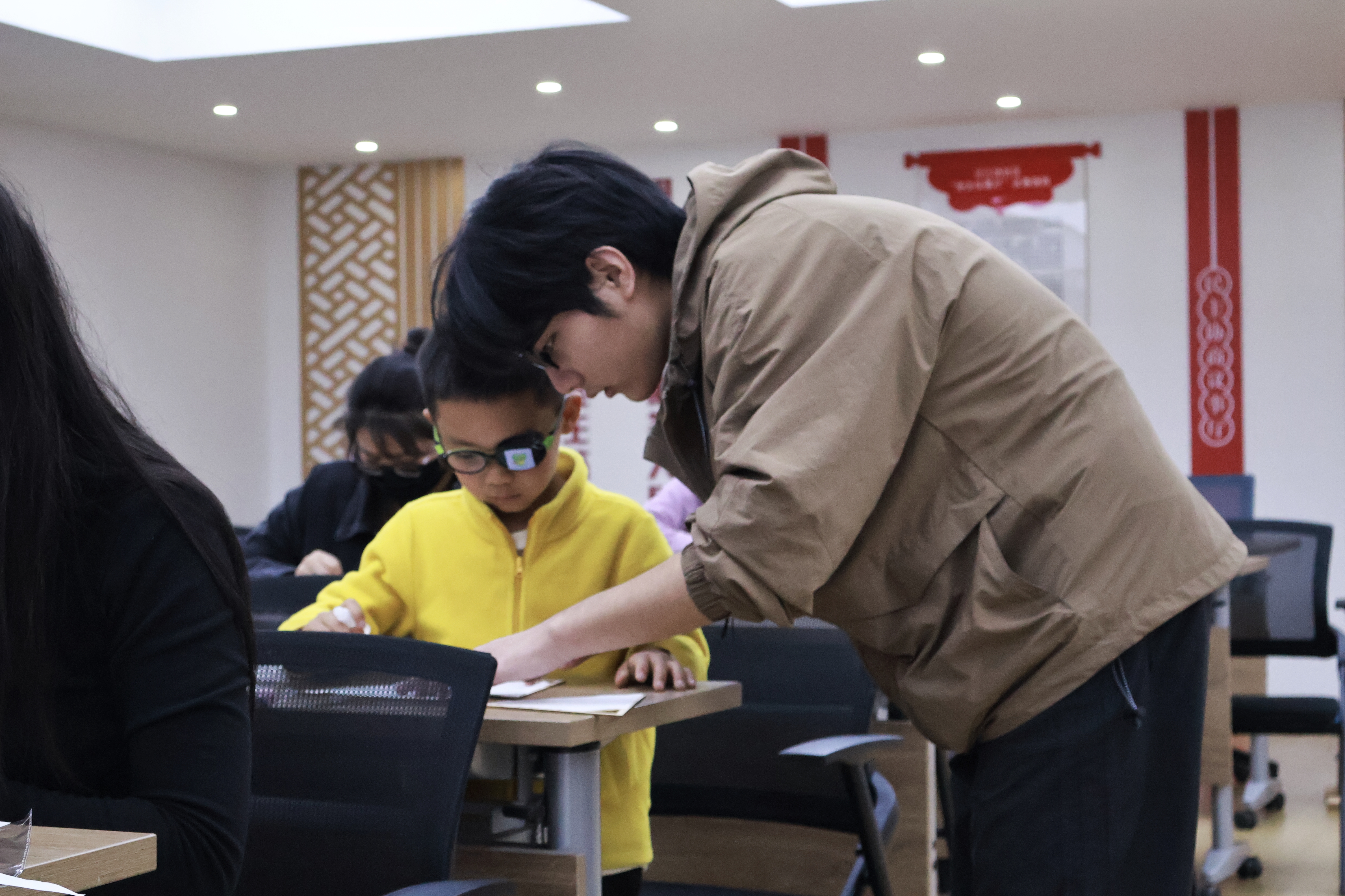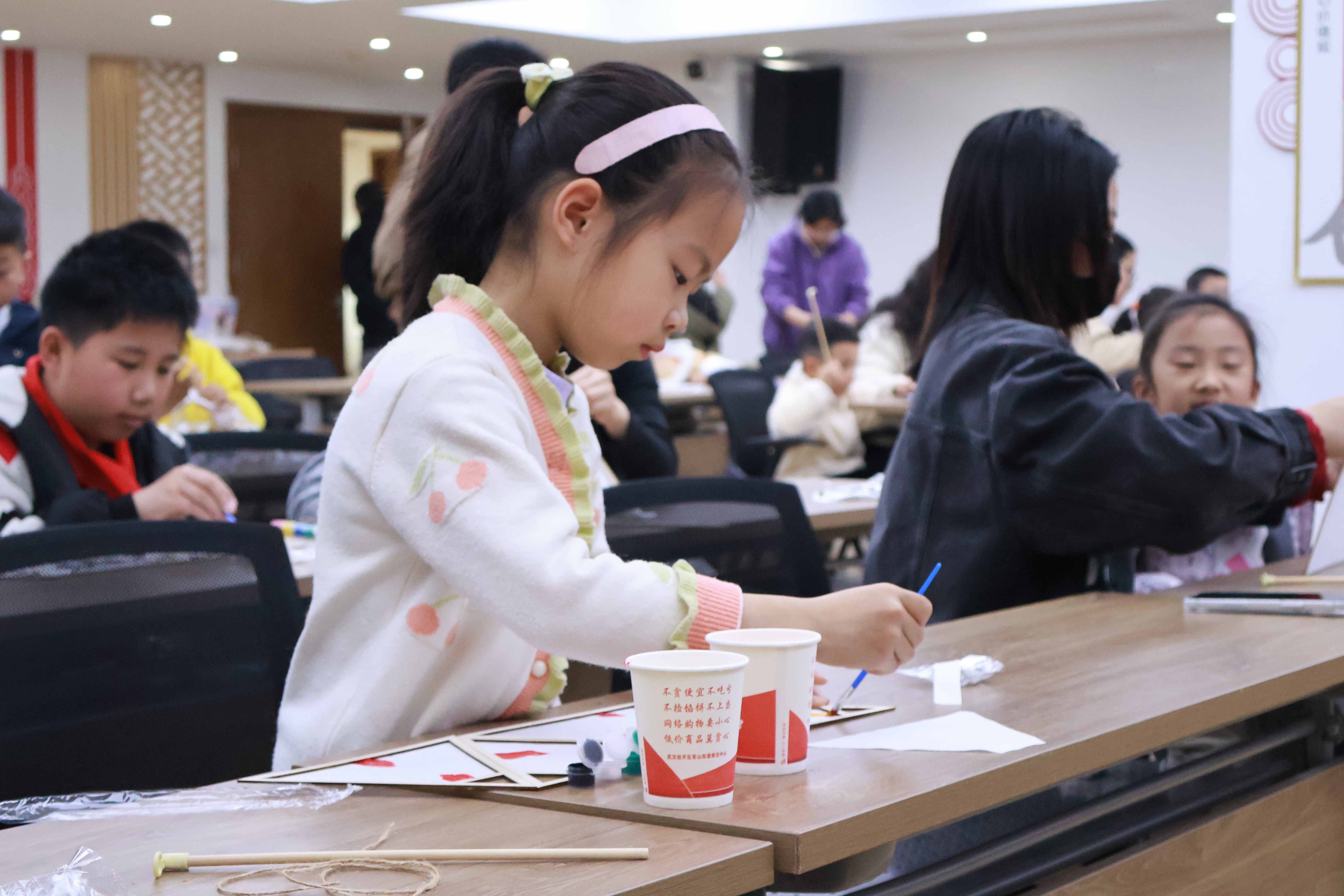 在实验环节,孩子们按照老师讲解的实验步骤,在志愿者们和家长们的帮助下,使用硬材料竹条、软材料宣纸和胶水制作灯笼。灯笼主体完成后,孩子们用颜料、扭扭棒等材料对灯笼进行装饰,他们有的在灯面书写寄语,有的在灯面绘制图案,在动手中感受软硬材料的特性。
