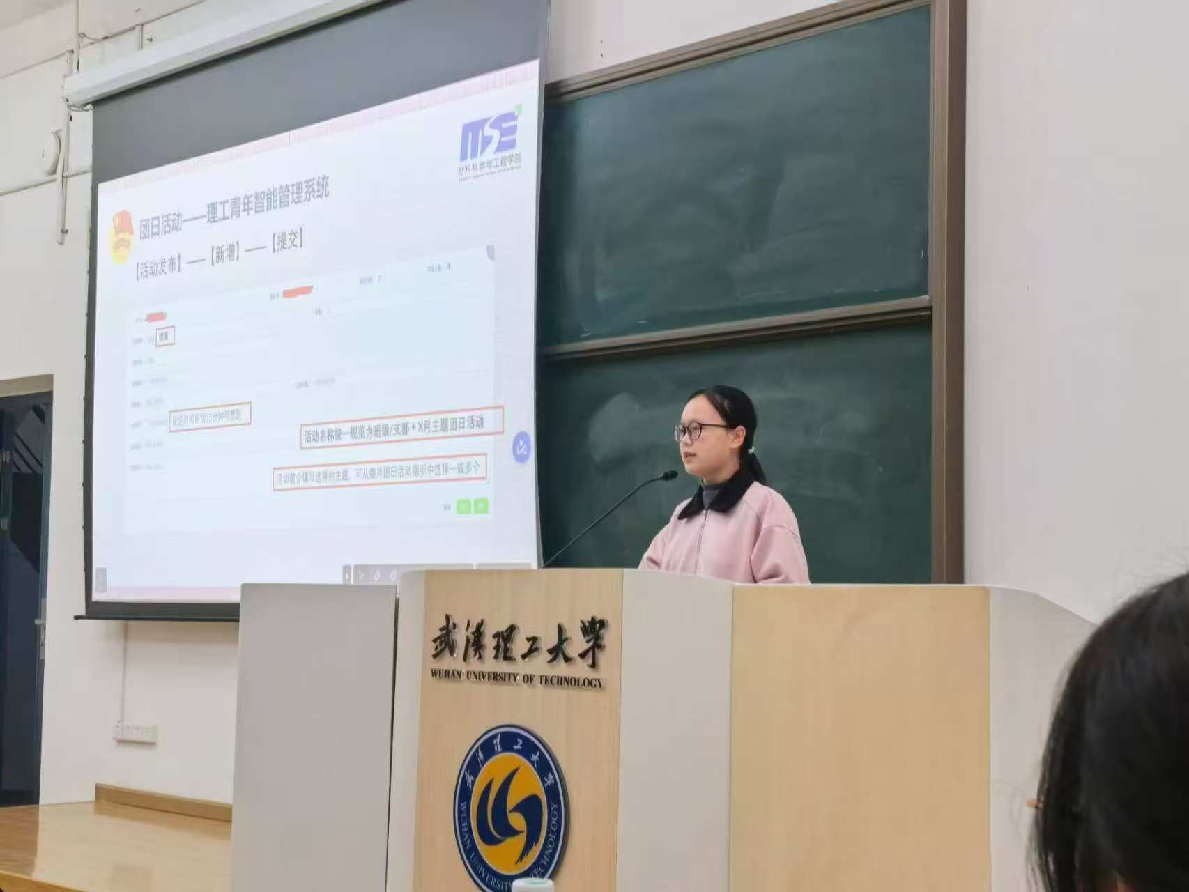 接下来,团委秘书部主要负责人张珂同学为大家介绍了秘书部的工作规划和团支部、团支书评议考核的内容。她简单地介绍了开展团日活动和专题政治学习的详细方法,重点传达了规范使用理工青年系统和智慧团建系统的必要性,让各班级团支书知晓了线上工作开展的流程。