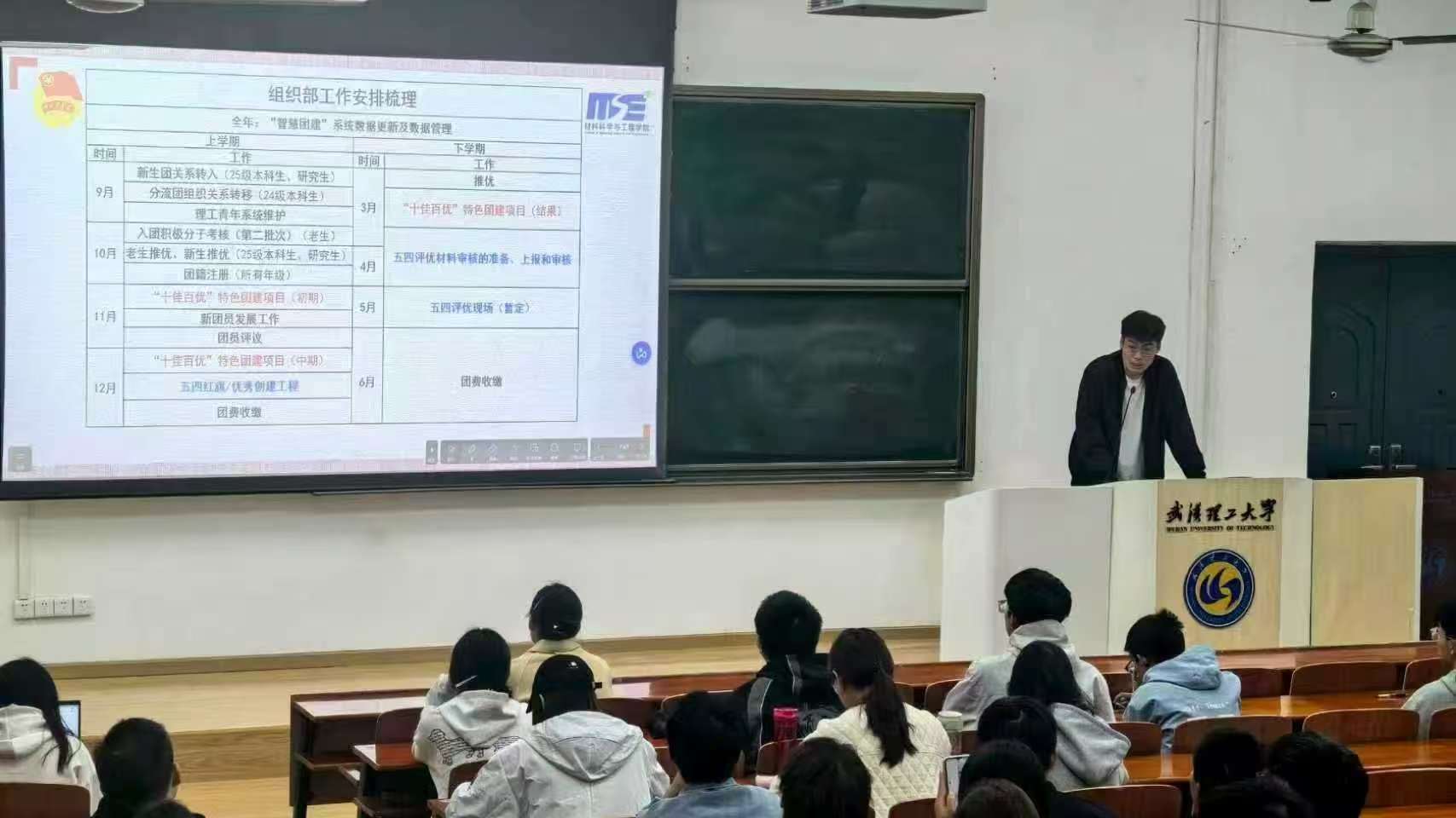 会议最后,团委组织部主要负责人刘轩同学提出了组织部未来工作的总体要求,为大家梳理了接下来全年的工作计划。他总结了2024年下半年的推优工作,还分享了往年“十佳百优”和五四评优活动的优秀案例,为各班活动的开展提供了模范样本,也体现了材料学院团委对与学生积极参与社会实践的支持与鼓励。