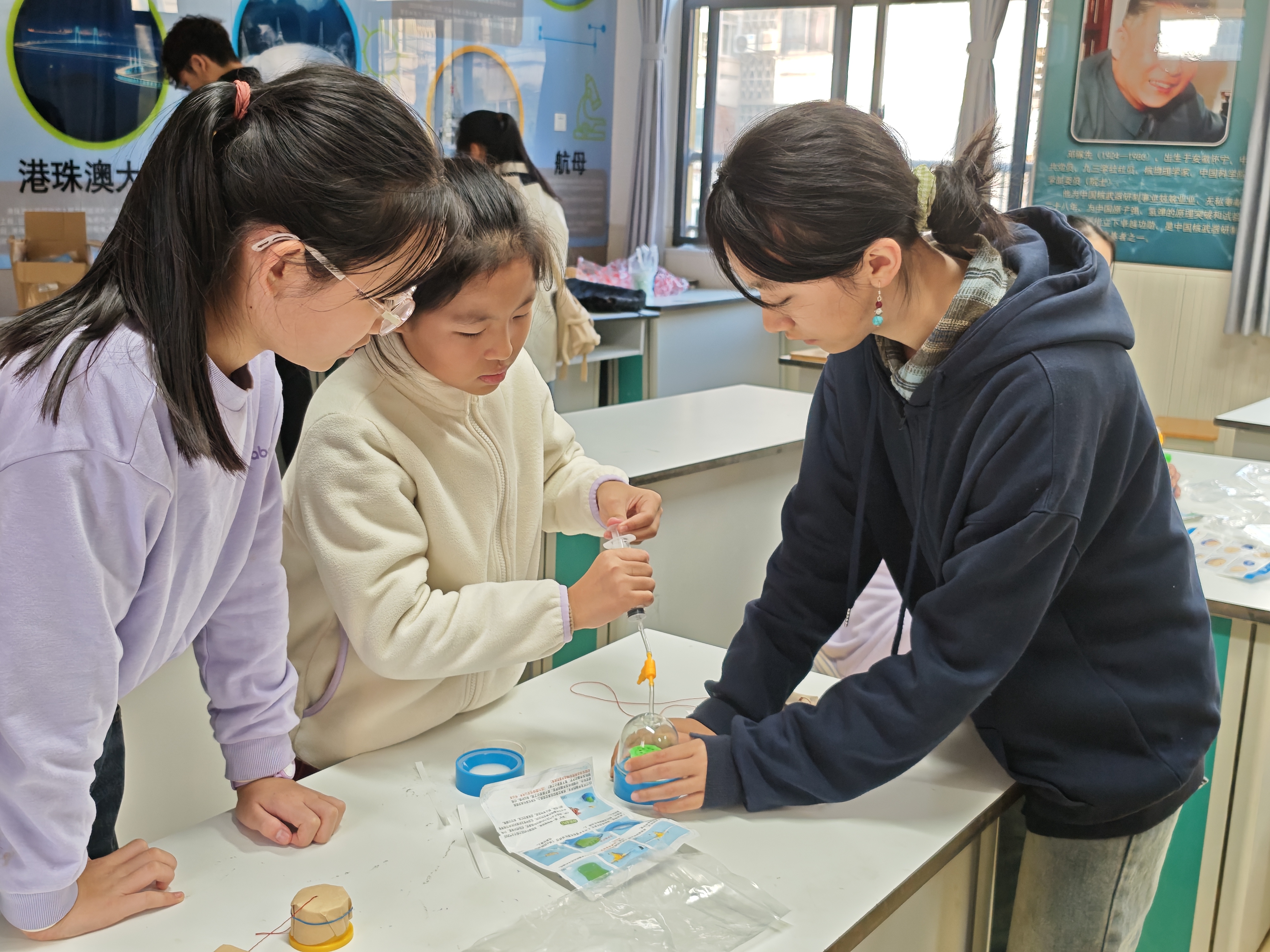 在“声音传播需要介质”体验实验中,志愿者准备了底座、罩子、发声装置与抽气设备。孩子们先感受常态下罩内物体的发声,接着由助教协助抽走罩内空气。他们惊喜地发现声音明显变弱,从而理解了声音传播需要介质,真空难以传声的科学原理。