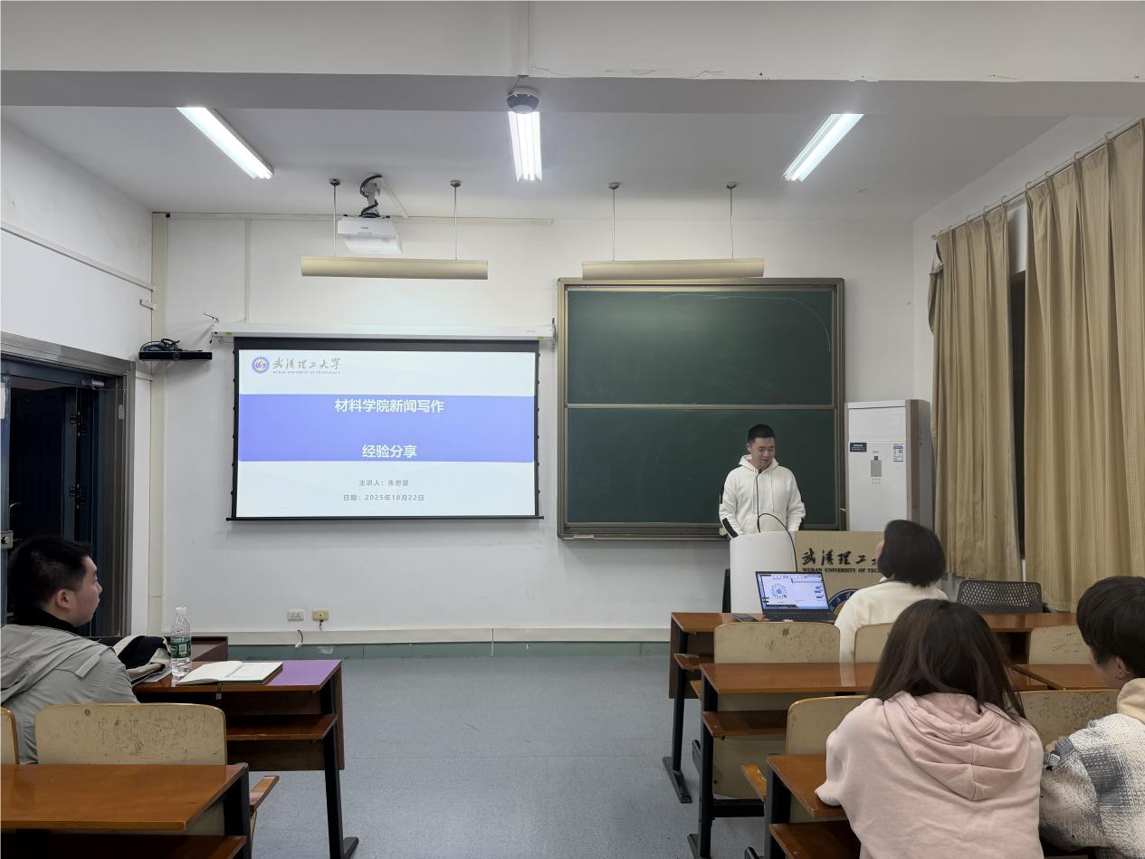 为全面提升学院学生的新闻撰稿能力,10月22日晚8时,材料学院在工大楼705教室举办了新闻写作经验分享会。研究生会指导老师胡雨婕、创新实践中心指导老师贺羽知、2023级研究生辅导员朱思盟,以及各学生组织宣传部全体成员参与了本次培训。主讲人朱思盟老师系统分享了新闻写作的核心知识与实用技巧。