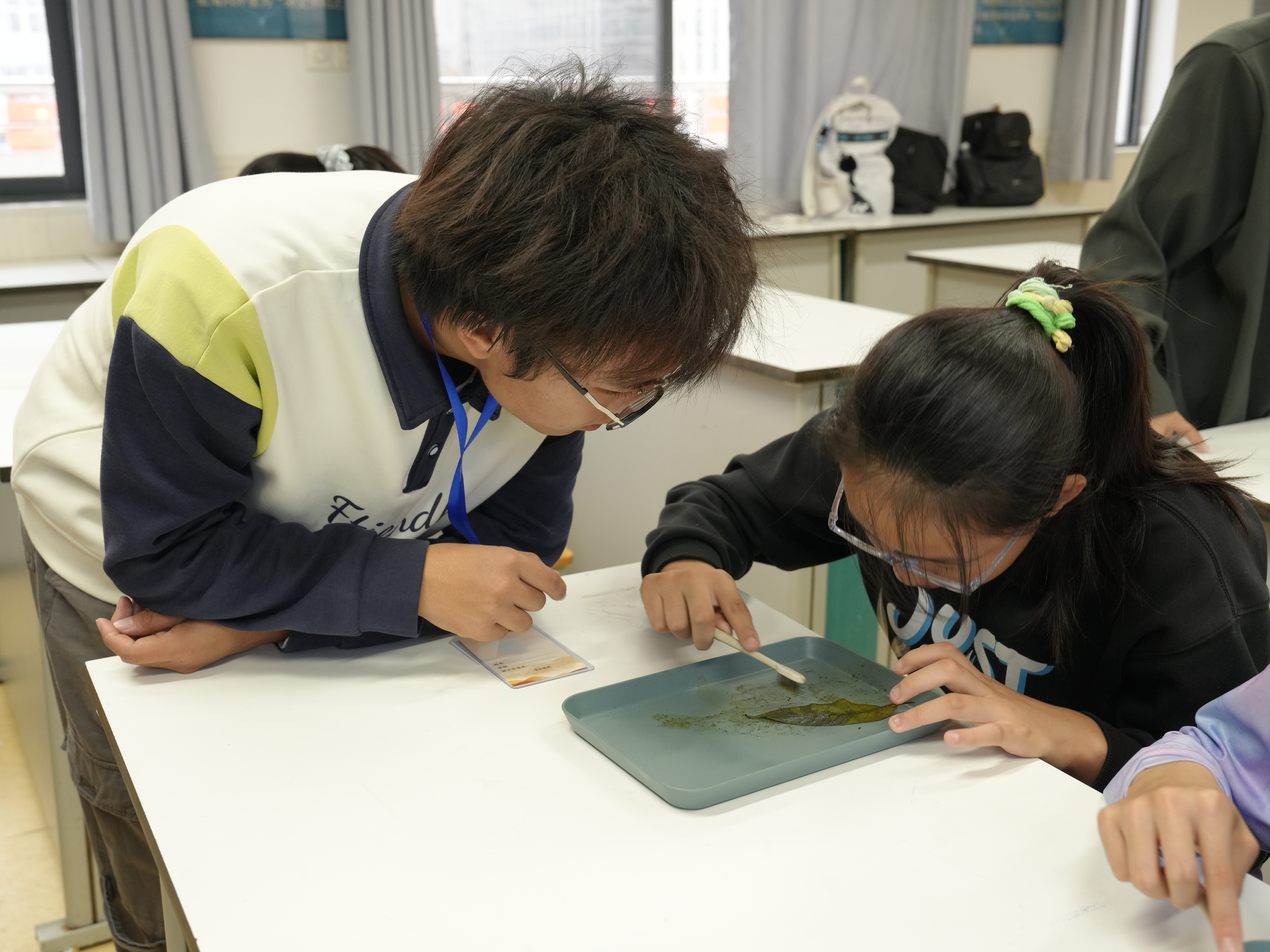 随后的“树叶书签制作”环节将课堂气氛推向高潮。活动前,助教老师们已将叶脉清晰的树叶浸泡软化,并为每位学生备齐了托盘、细毛刷、环保染色剂等工具。制作过程中,孩子们化身“小小工匠”,小心翼翼地用细毛刷剔除叶肉;遇到困难时,便举手寻求帮助,助教老师们则俯身细致指导。叶肉清除并清洗完毕后,孩子们又按照各自喜欢的颜色为树叶染上缤纷色彩。最后,经助教老师统一打孔、穿线,一枚枚兼具自然纹理与童趣设计的树叶书签便新鲜出炉。孩子们举着自己的作品互相展示,脸上洋溢着满满的成就感。