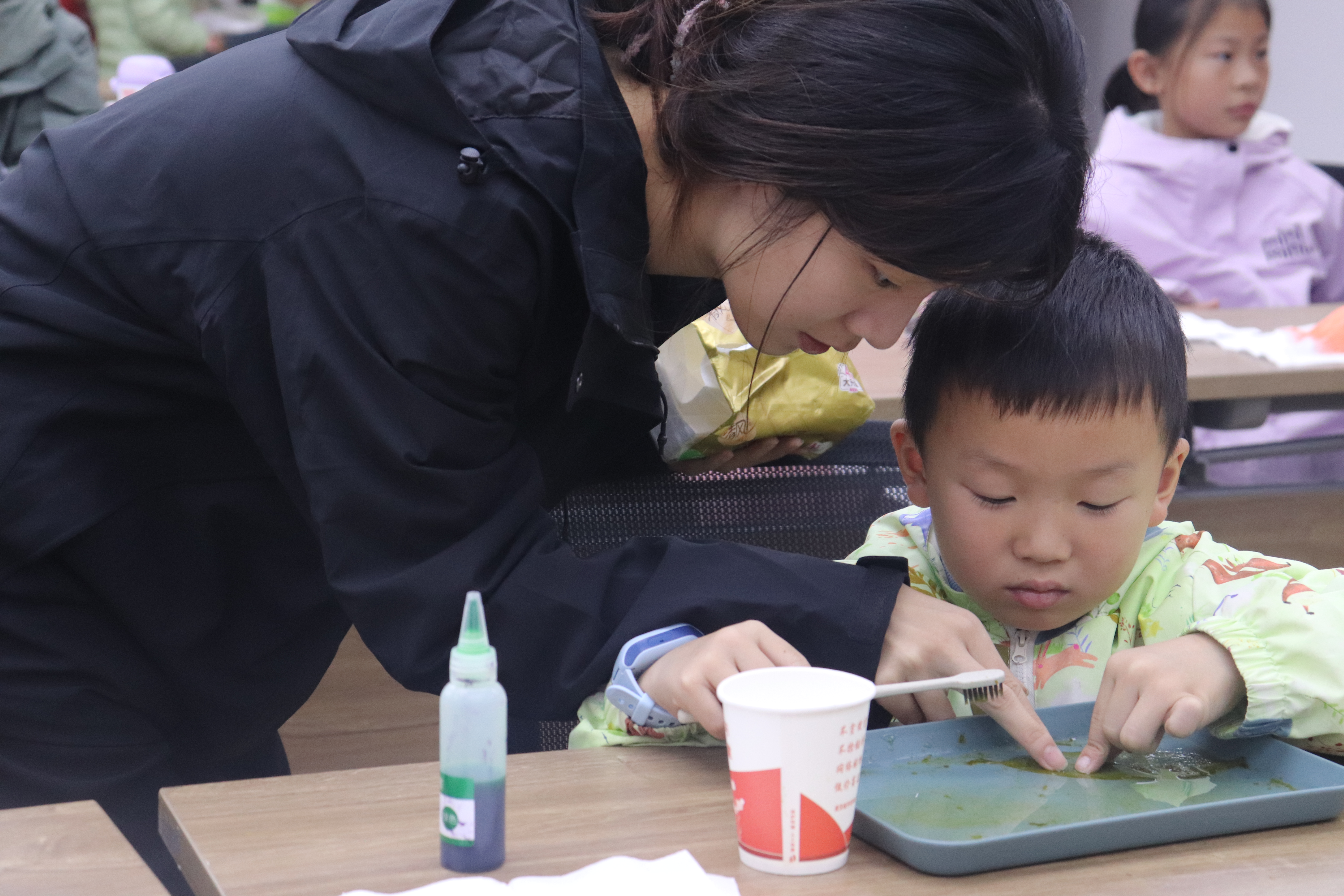 活动伊始,“小张老师”以通俗的语言和生动的案例,为孩子们讲解了生物材料的定义与特性。通过趣味问答,她引导孩子们观察叶片纹路、辨识生活中的生物材料,成功点燃了大家的探索热情。随后的叶脉书签制作环节将现场气氛推向高潮。在志愿者的手把手指导下,孩子们兴致勃勃地投入到叶片脱绿、清洗、晾干和塑封等一系列步骤中,志愿者们则耐心解答着每一个操作疑问。