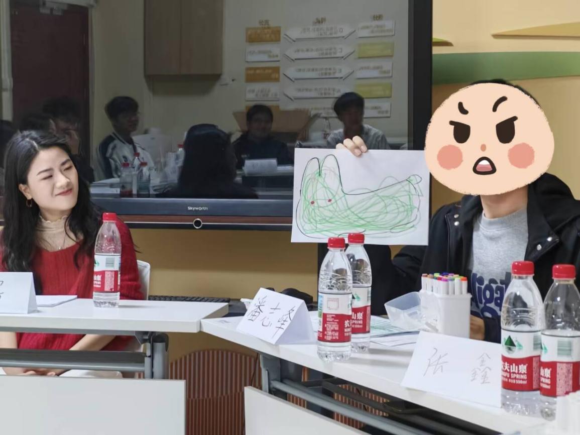 活动伊始,通过轻松的自我介绍,同学们迅速拉近距离,营造出融洽温暖的集体氛围。随后,覃露老师以“警察抓小偷”趣味游戏调动气氛,引导大家逐步放松身心、打开心扉。在核心环节中,同学们在老师的引导下闭目静心,觉察自身情绪,将或焦虑、或喜悦、或烦躁的内心状态,转化为纸上的色彩与线条。大家依随直觉自由创作,再对画作进行调整与完善,最后围坐一圈,分享各自的“情绪画像”与创作思路,在倾听与交流中增进理解。