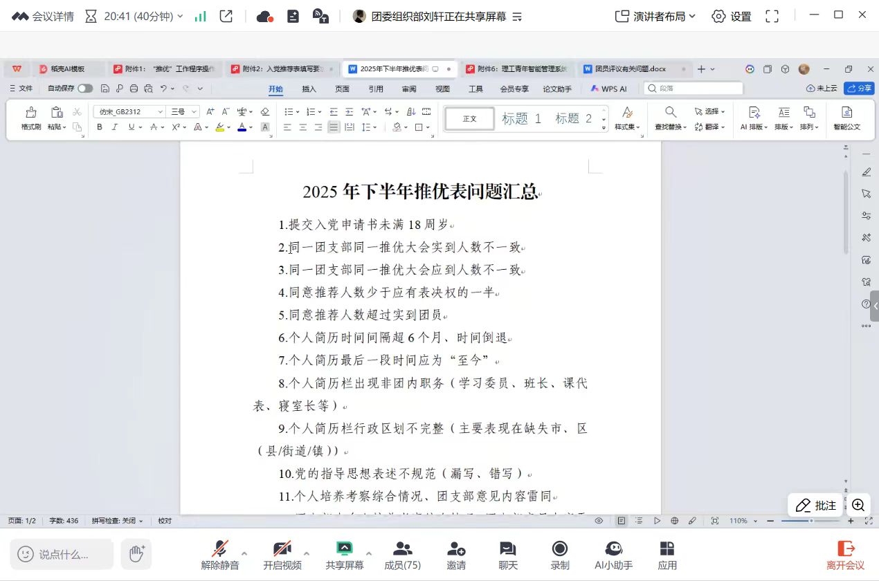 会议主要分为三个部分进行。首先,刘轩同学详细讲解了推优入党的完整流程,重点说明了入党推优表填写的具体要求和注意事项,同时总结了去年工作中出现的常见问题,提醒各位团支书做好自查自纠工作。