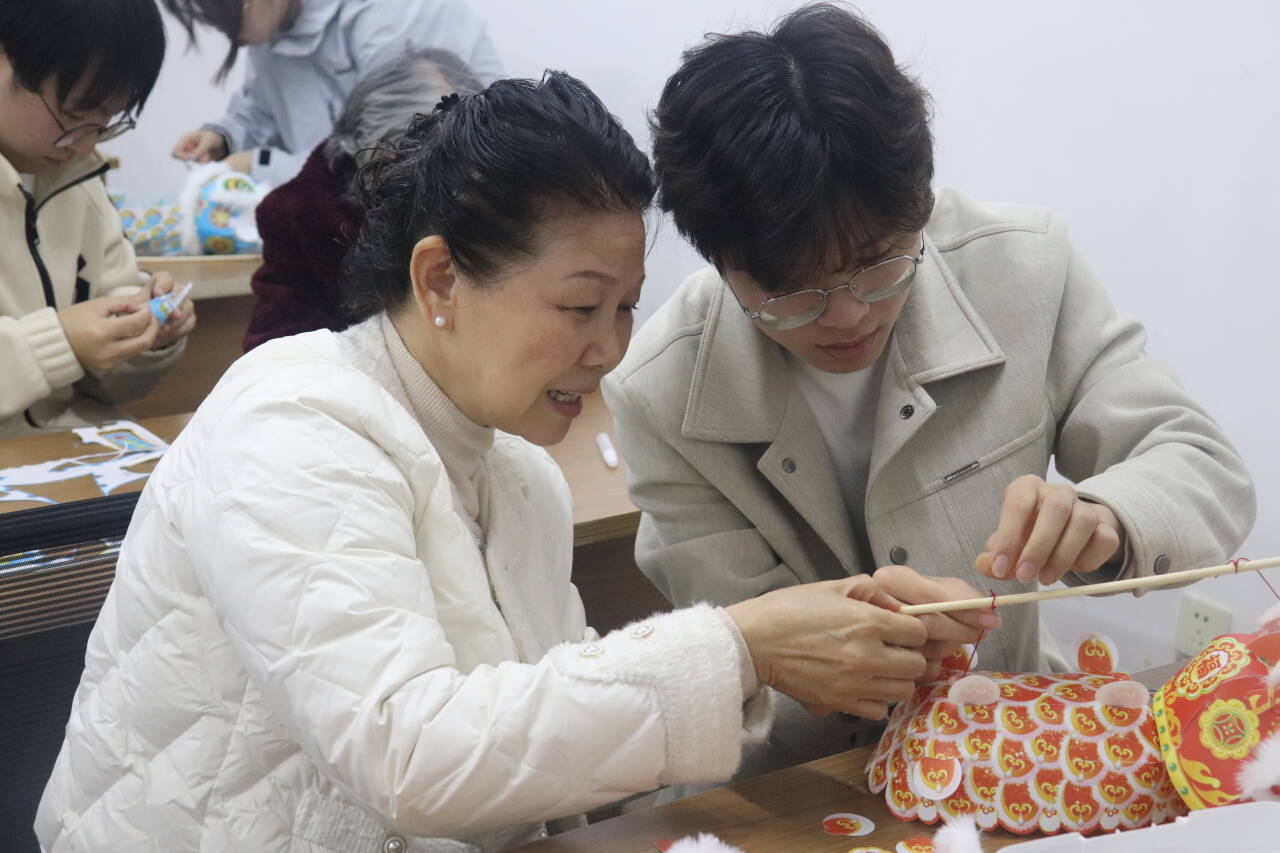 活动伊始,志愿者们为每位老人分发了纸质模板、彩灯等制作材料。面对略显繁琐的制作步骤,大家结对合作,对照视频教程一步步学习。从部件拼接、细心粘贴装饰,到最后挂上灯芯,原本零散的材料在大家手中慢慢成型,变成了一只只神气可爱的醒狮灯笼。欢声笑语间,老人们从起初的生疏摸索,到渐渐熟练上手,一只只喜庆灵动的醒狮灯笼相继成型。大家互相展示着亲手制作的成果,灿烂的笑容与闪烁的灯笼相映成趣,点亮了现场温馨的氛围。