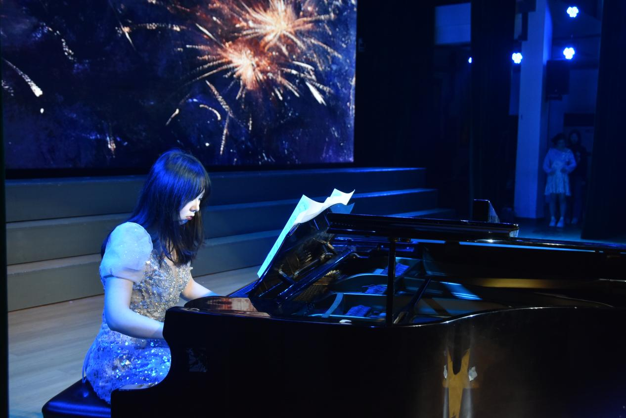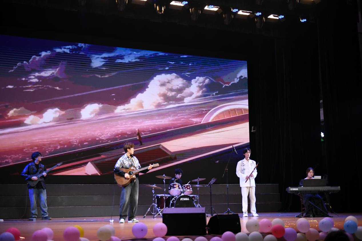 画风婉转流转,国风古韵与诗意温情次第绽放。洪玮琪、尹珊、孔卓三位同学联袂献上歌伴剑舞《虞兮叹》,刚柔并济的剑舞搭配大气深沉的歌声,深情演绎霸王虞姬的凄美绝恋,将古典韵味与英雄豪情融为一体,为观众奉上一场视听俱佳的国风盛宴。片刻之后,器乐队携手辅导员梅思源带来《flower dance》与《river flows in you》,空灵澄澈的琴音缓缓流淌,洗去喧嚣,为现场添上一抹宁静与诗意。