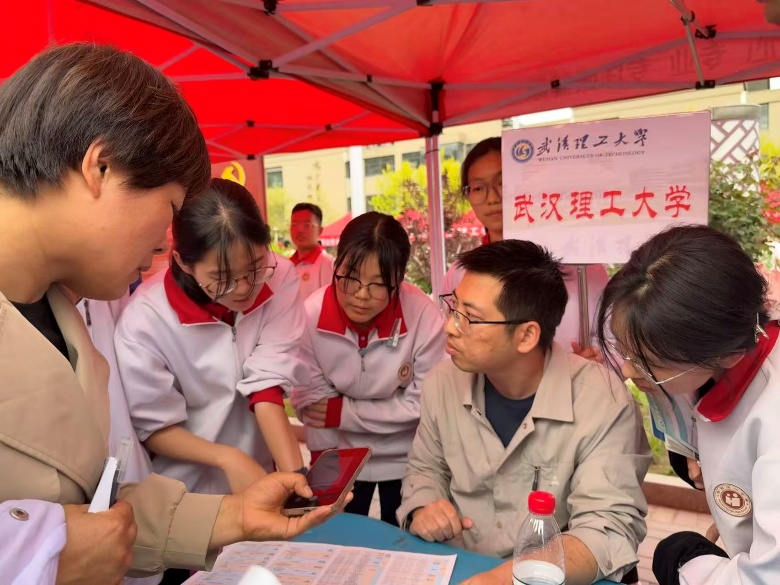活动首先以开放式咨询形式进行。欧阳迪、蔡俊向现场学生和家长发放招生宣传册和文创礼品,介绍了武汉理工大学近年来在河北省的招生情况,并结合不同年级学生的实际需求,给予升学规划建议。针对家长们普遍关心的志愿填报、珠峰班招录要求、转专业政策以及中外合作办学专业设置等问题进行了耐心细致地解答。