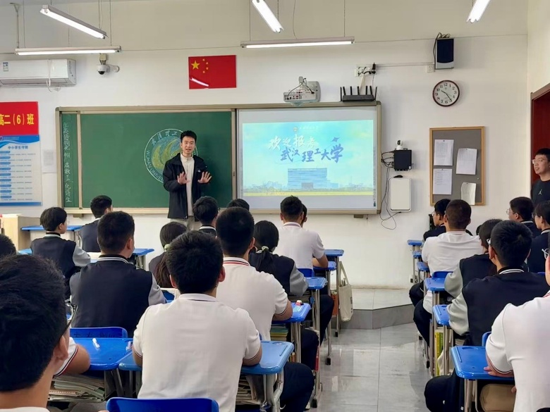 在课堂宣讲环节中,蔡俊围绕武汉理工大学的办学历史、学科建设和人才培养模式等内容做了系统介绍,并结合学校近年来取得的办学成果以及校友发展情况与同学们进行了深入交流。宣讲最后,蔡俊勉励高中学子坚定目标、脚踏实地,科学规划备考方向,并欢迎同学们积极报考武汉理工大学。