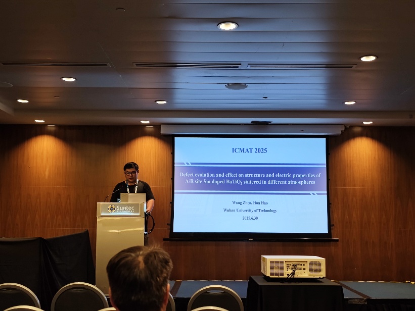 武汉理工大学材料学院王震博士于2025年6月30日在铁电材料、压电材料、介电材料的表征与分析分会场,作题为“Defect Evolution and Effect on Structure and Electric Properties of A/B Site Sm Doped BaTiO3sintered in Different Atmospheres”的口头报告。汇报内容:Sm掺杂BaTiO3陶瓷的烧结气氛可精准调控掺杂位点,进而主导材料电学性能。空气中低掺杂时呈半导体特性,高掺杂时氧空位捕获电荷显著提升绝缘性。还原气氛则因氧空位激增维持强半导体特性。团队通过复阻抗分析揭示晶粒内部主导电阻变化,为开发高介电、低损耗的贱金属电极MLCC提供了关键缺陷调控策略。