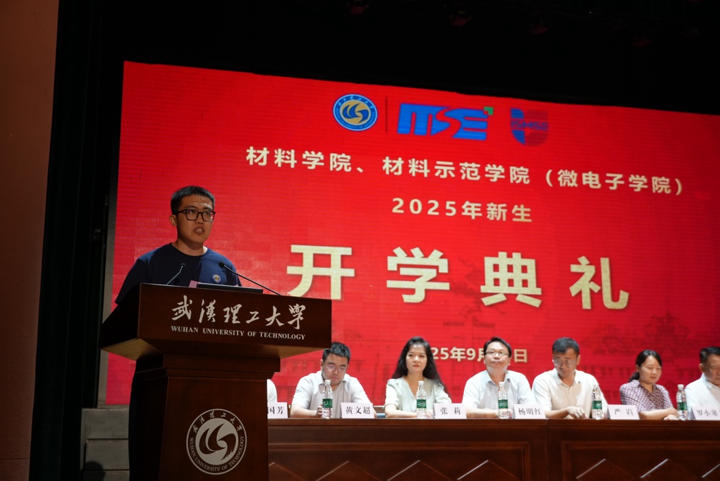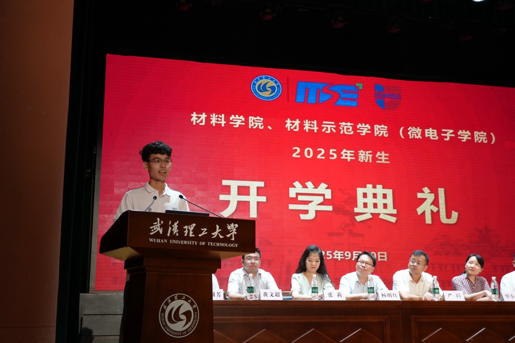 来自材科珠峰班的新生代表赵益江则分享了自己与材料学科的 “结缘之路”。填报志愿时,武汉理工大学材料学科的雄厚师资、先进平台与浓厚学术氛围,让他在无数选项中坚定选择了这里。他表示将以“用双手触摸科学温度、让材料服务人间烟火”为目标,与全体新生共同开启“材料人”的成长征程。