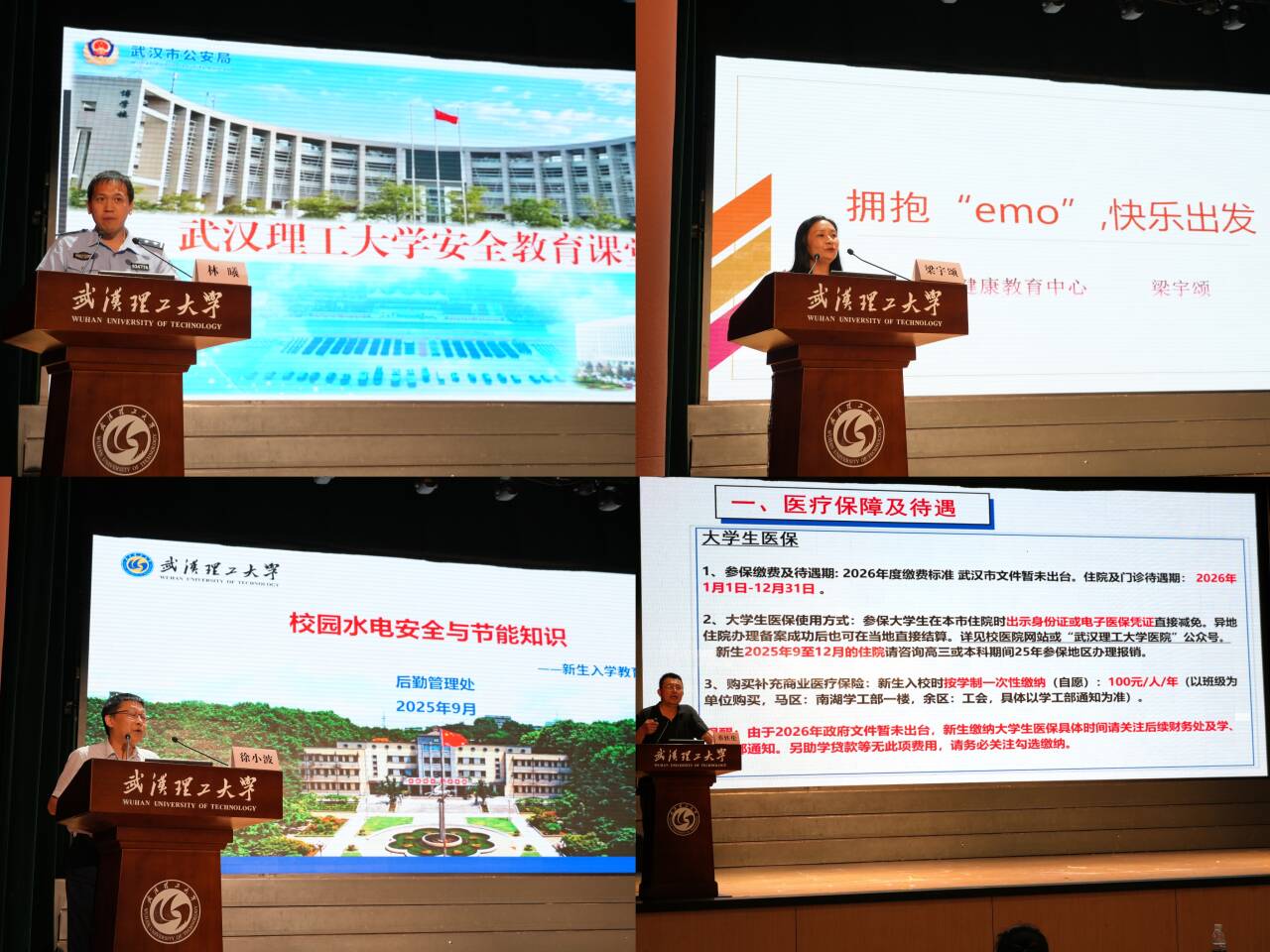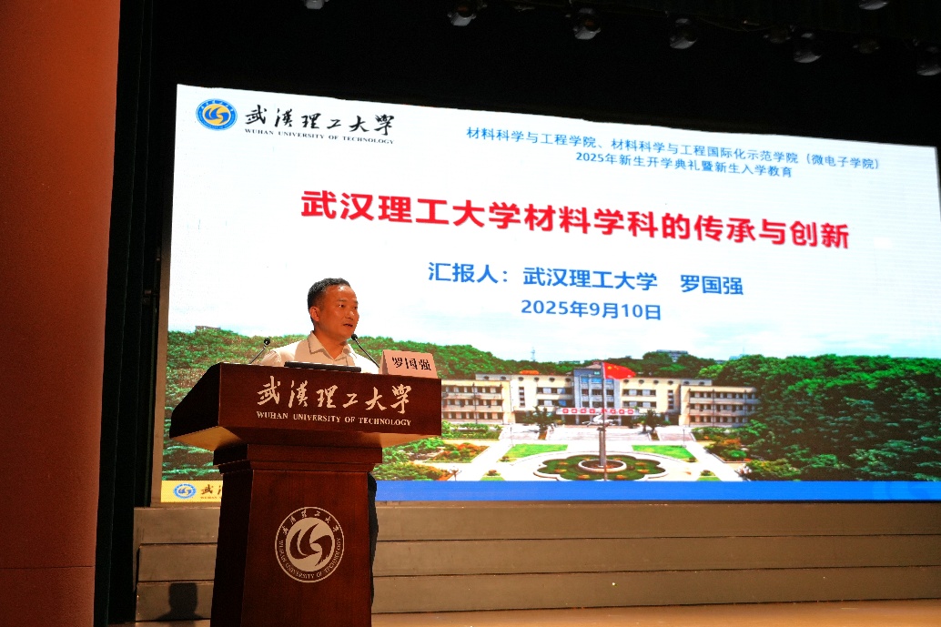 在新生入学教育环节。材料学院院长罗国强以《武汉理工大学材料学科传承与创新》为题讲授“开学第一课”,系统介绍了学科的深厚积淀、创新成果与发展愿景。校医院副院长蔡轶伦、心理健康中心梁宇颂老师、后勤管理处副处长徐小波、马房山派出所林曦警官分别围绕健康知识、心理调适、水电安全与法制教育作了专题报告,为新生尽快适应大学生活提供全方位指引。