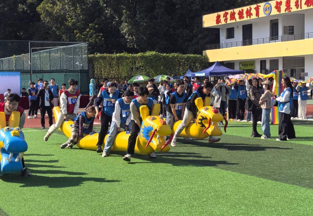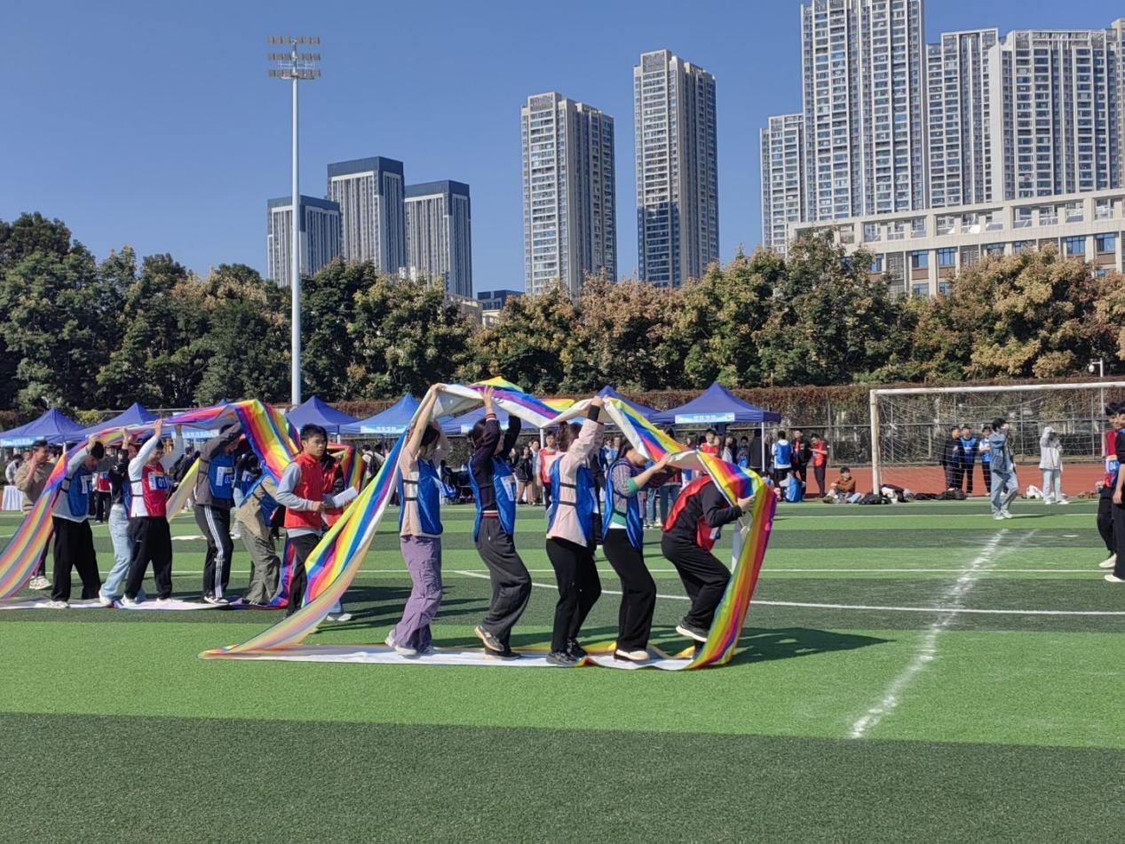 “滚滚红尘”项目以趣味性著称,五名队员共同在布袋中跳跃前进,考验着平衡与合作,最终在欢呼声中取得了全校第三的好成绩。