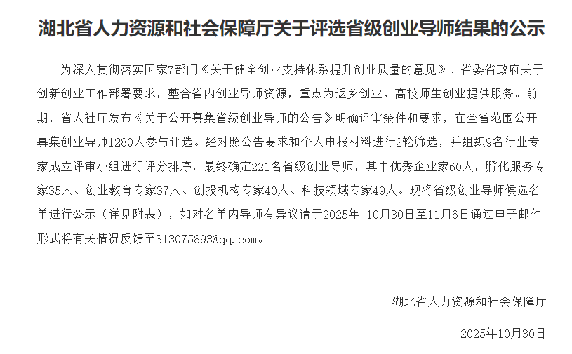 10 月 30 日,湖北省人力资源和社会保障厅公示 2025 年省级创业导师评选结果。经个人申报、材料审核、专家评审等规范流程,我院在读博士、武汉市覆兴科技有限公司董事长张嘉翊成功入选省级创业导师候选名单。