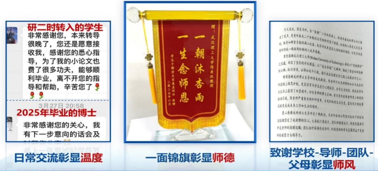 在团队办公室,一面印着“一朝沐杏雨,一生念师恩”的锦旗格外引人注目。这是2022级硕士生于同学毕业时赠送的礼物,背后是团队导师对学生的悉心关怀:为家庭困难学生争取科研补助,陪熬夜做实验的学生吃夜宵,在求职关键期逐份修改简历……“导师不仅教我们做科研,更教我们做人做事。”已成为某市政公司研发骨干的硕士生冷同学回忆道。如今,“导师有榜样、学生有方向、团队有生态”已成为该团队最鲜明的师德标签。