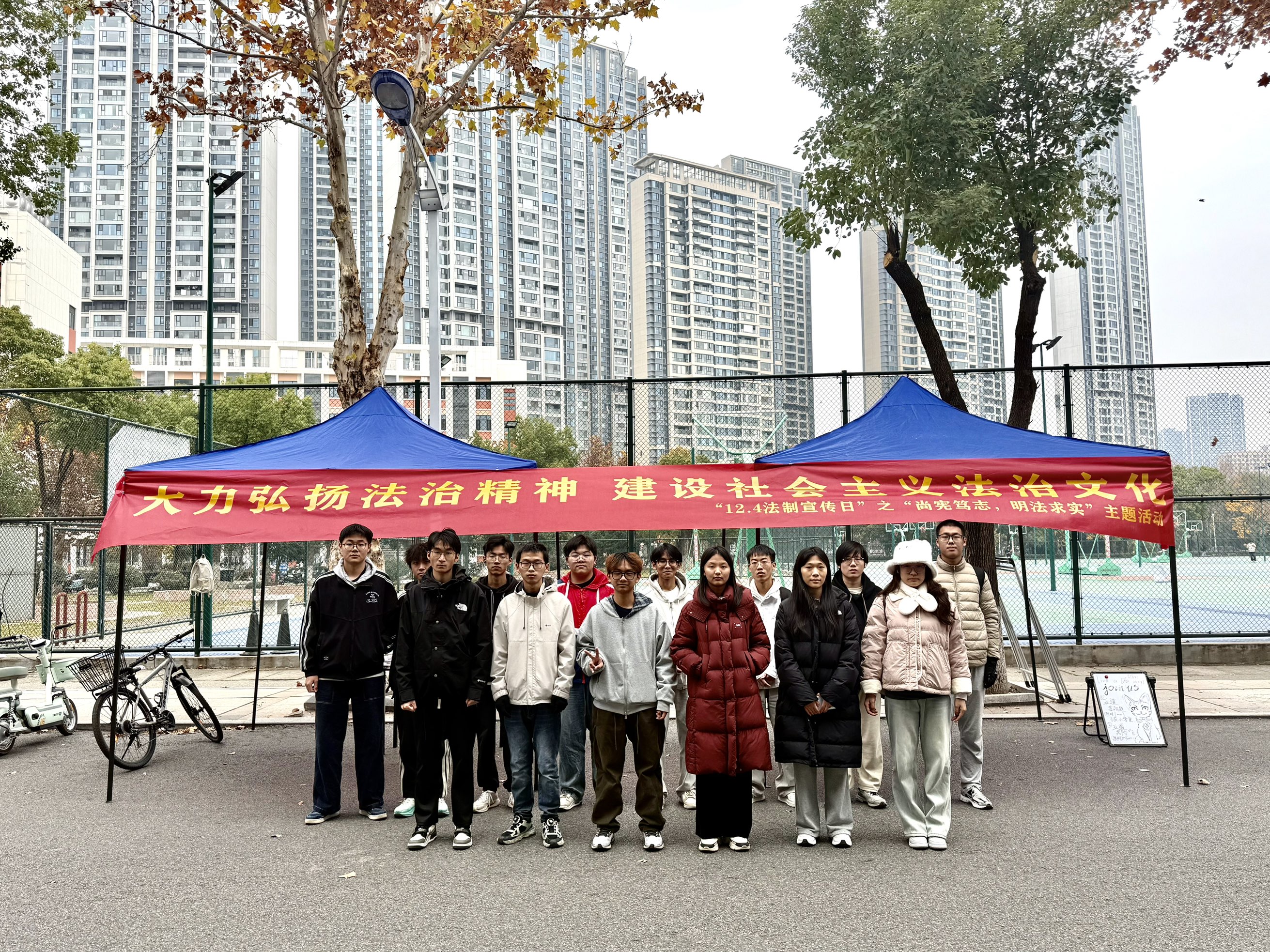 活动当日,各学院工作人员提前就位,精心布置活动现场,设立了法律知识有奖问答、法治感悟留言栏、案例探讨交流等互动区域。活动正式开始时,宣传人员热情地向过往同学介绍活动主旨与环节,积极引导大家参与。同学们踊跃响应,纷纷驻足参与法律知识问答,在留言栏认真写下自己对法治的理解与期许,抽奖环节更是将现场气氛推向高潮。活动现场井然有序且氛围热烈。工作人员不仅通过题目互动普及法律条文,还结合具体案例进行分析解读,使“尚宪笃志,明法求实”的理念在轻松活泼的交流中深入人心,有效激发了同学们学习法律知识的热情。活动最后,全体在场工作人员合影留念。