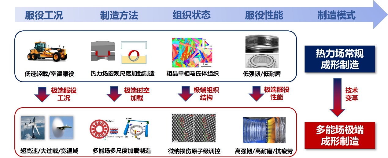 该项目针对高端装备轴承传统热力场制造组织性能调控瓶颈难题,创新提出轴承多能场极端成形制造思路,通过热-力-电-磁多场复合加载宏-微-纳多尺度调控,构筑高强高韧复相组织、修复微纳损伤缺陷,突破轴承制造性能和寿命极限,实现高端装备轴承批量应用。