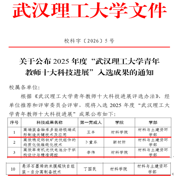近日,2025年度“武汉理工大学青年教师十大科技进展”评选结果揭晓。我院推荐的三位青年教师科研成果全部入选,充分展现了学院青年科研队伍的科技创新活力与未来发展潜力。