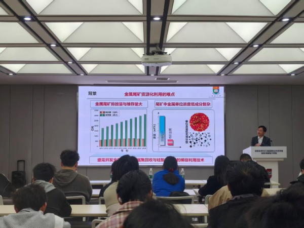报告中,蓝教授首先介绍了研究背景,指出金属尾矿的大量堆积造成了资源浪费与环境污染。随后,他详细阐述了金属尾矿的成分及相关研究内容,包括原料预处理工艺、典型金属基环境功能材料的开发与应用、基于过渡金属组分的镍尾矿基功能二代材料特性,以及金属尾矿的可持续储存策略。最后,蓝教授介绍了香港大学、其研究团队的教学科研情况及取得的学术成果,并热情鼓励在场学生未来积极报考香港大学继续深造。